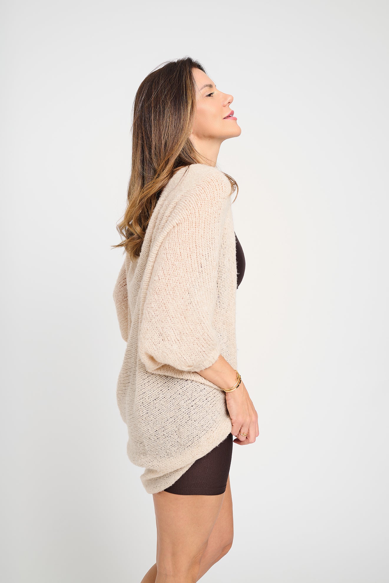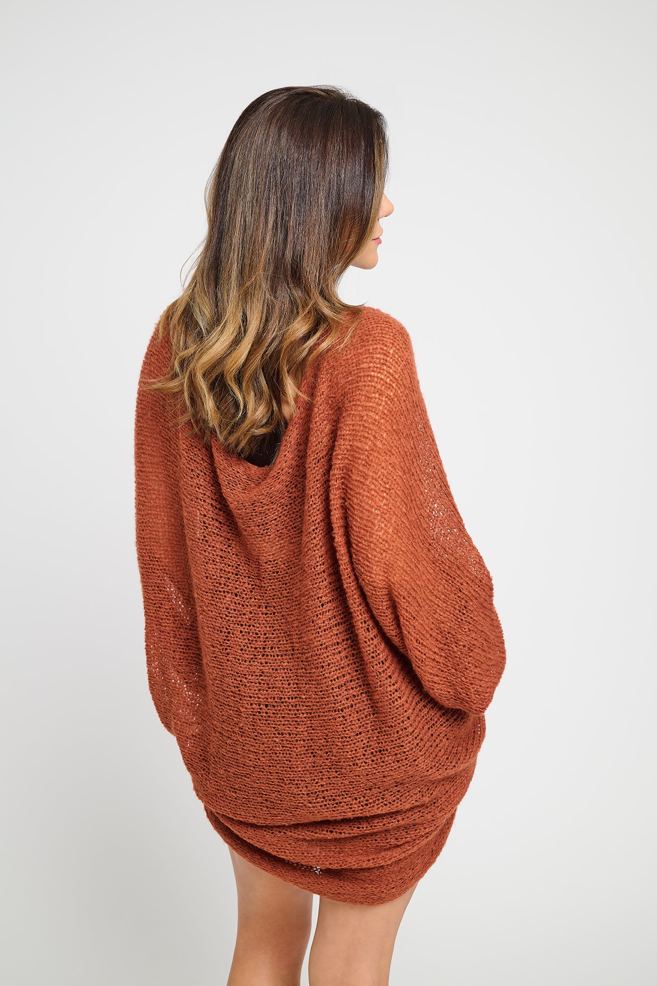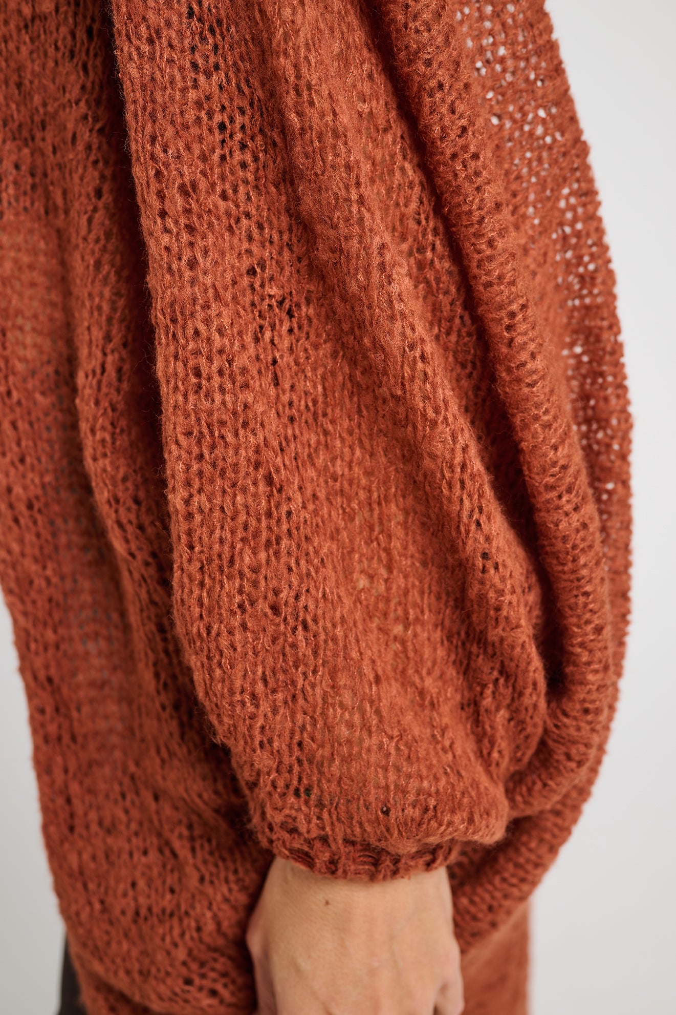 Casaco produzido em máquina de tricô artesanal, com fio Montblanc de toque macio e estrutura envolvente. Cada peça é cuidadosamente finalizada com costura manual, realizada por artesãs brasileiras, respeitando o tempo, o saber e a autenticidade do trabalho feito à mão.