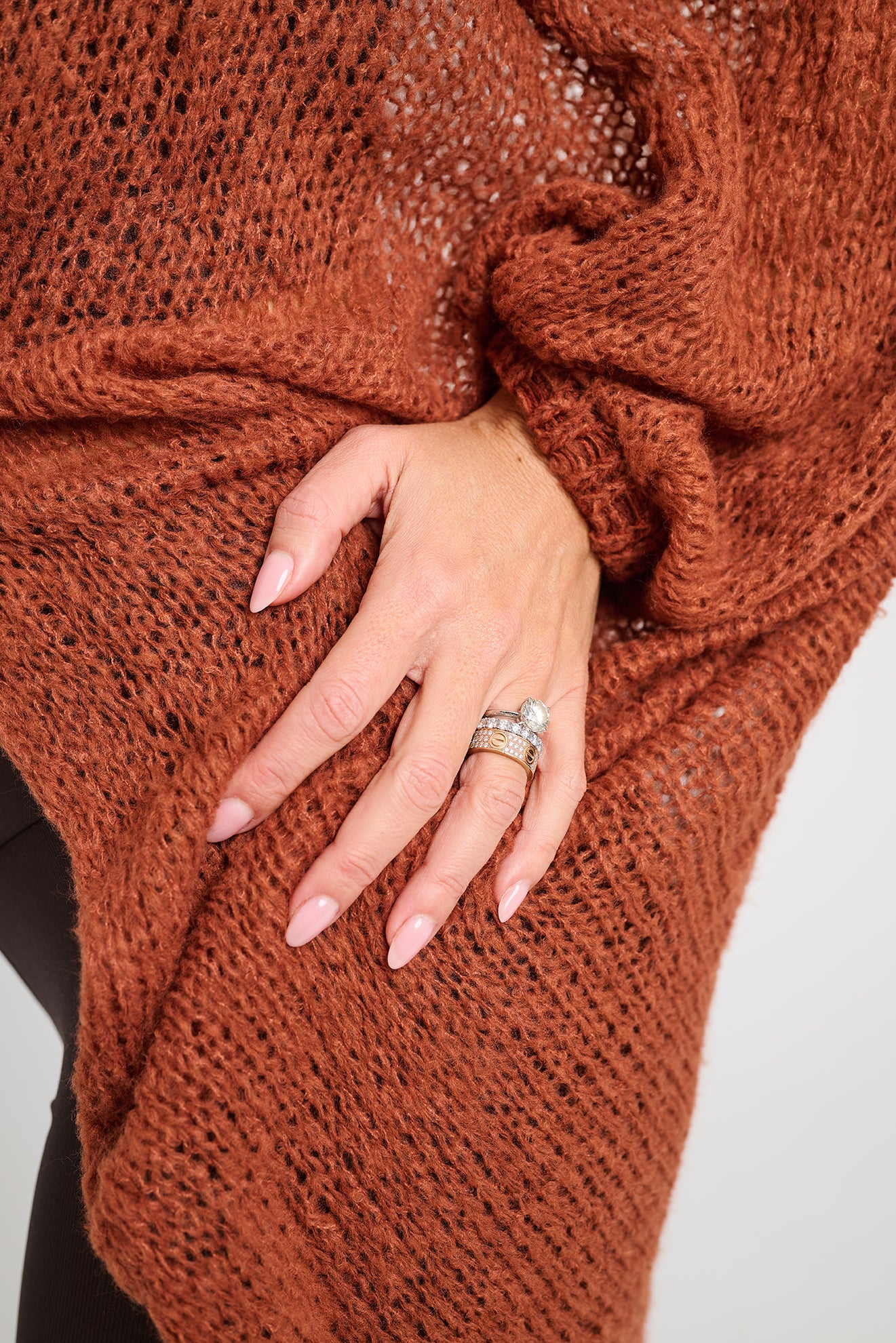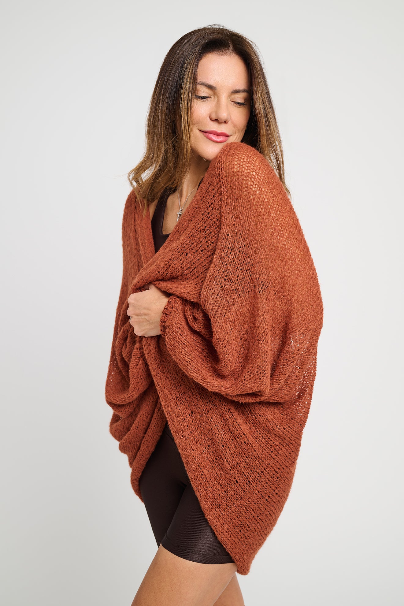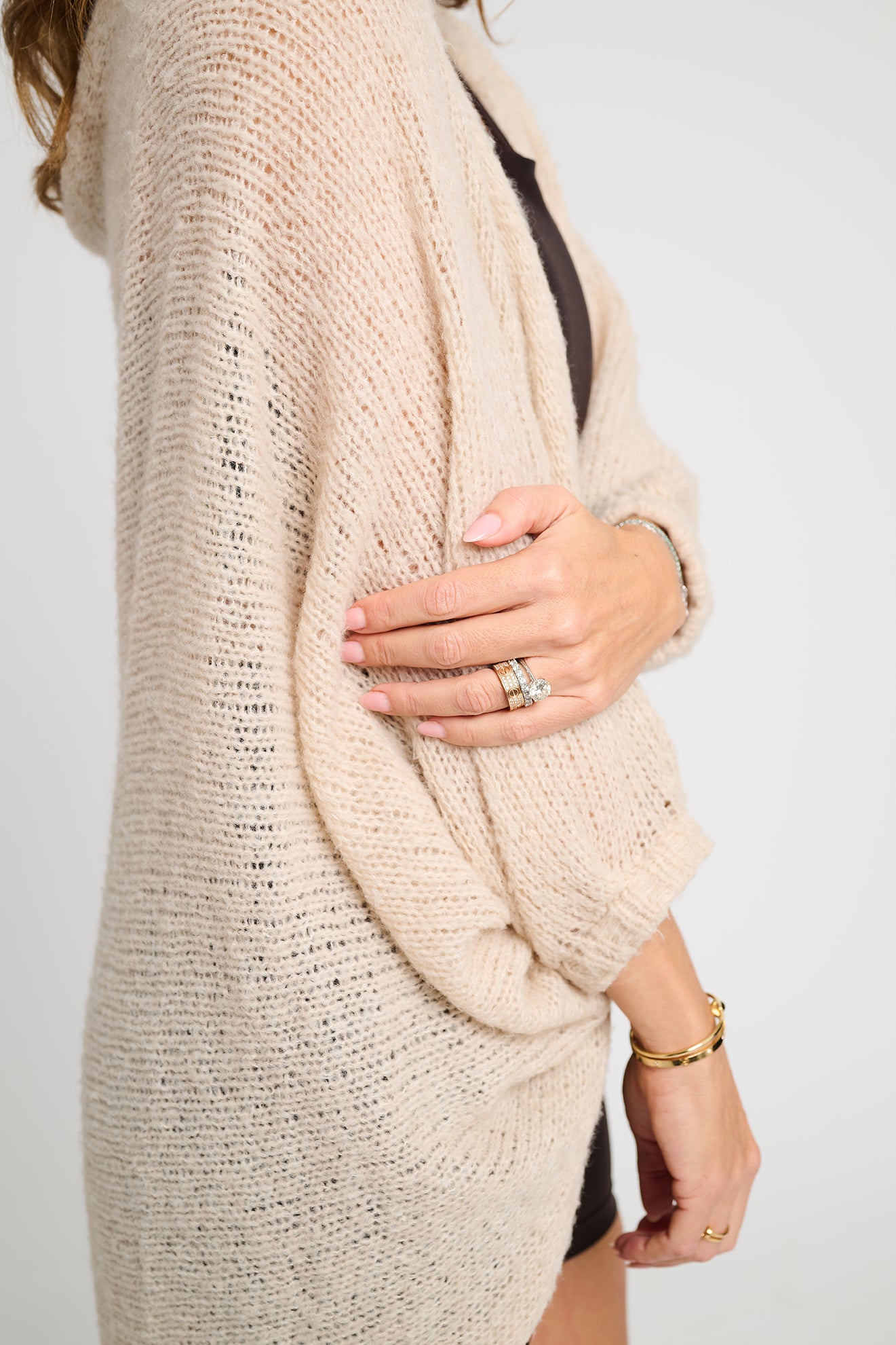 Casaco produzido em máquina de tricô artesanal, com fio Montblanc de toque macio e estrutura envolvente. Cada peça é cuidadosamente finalizada com costura manual, realizada por artesãs brasileiras, respeitando o tempo, o saber e a autenticidade do trabalho feito à mão.